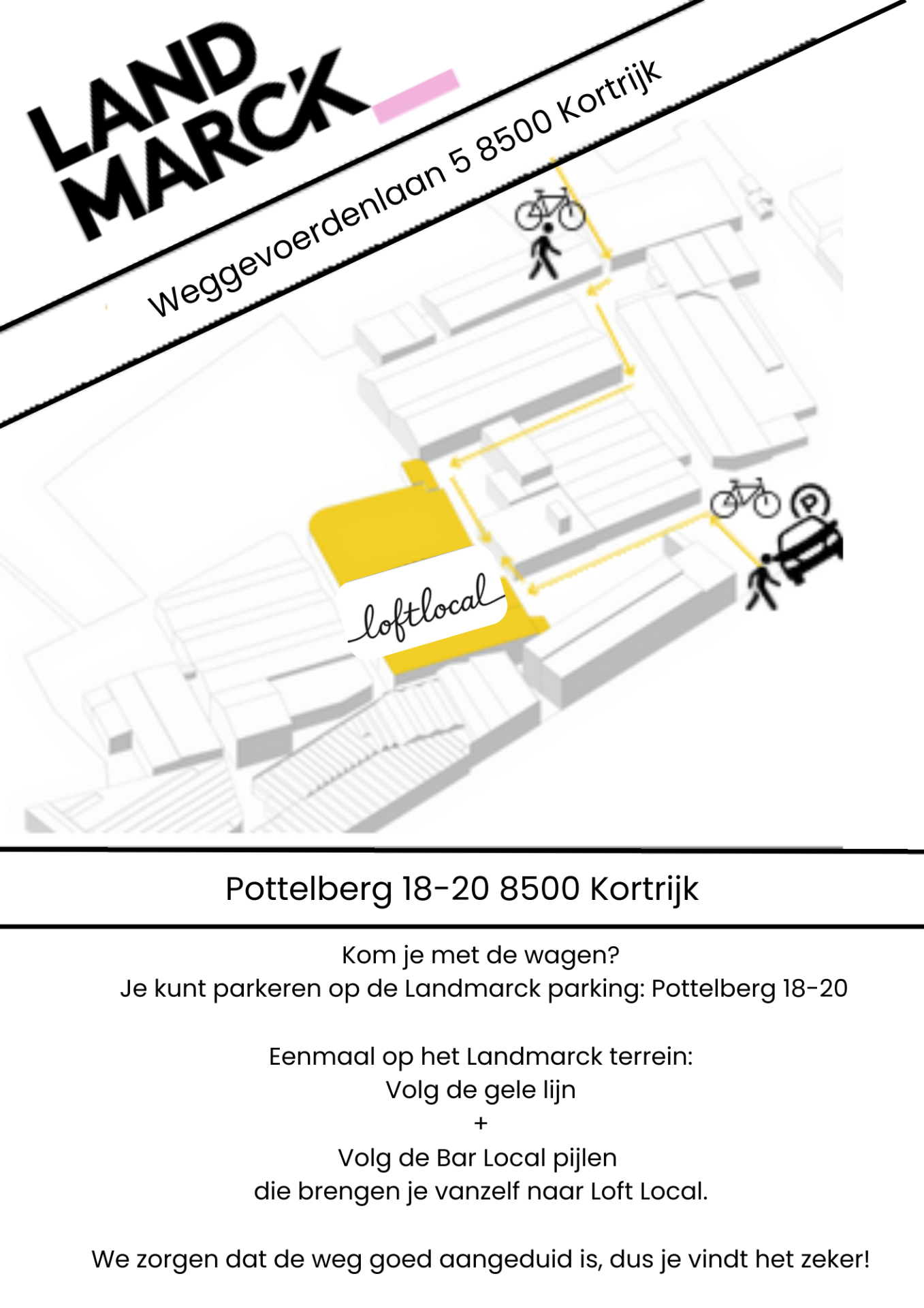 Pottelberg, parking tussen 18-20, 8500 Kortrijk, dit is het adres van de parking van Landmarck. Laat je niet afschrikken door de gesloten poort, het hek staat ALTIJD open voor voetgangers en fietsers.